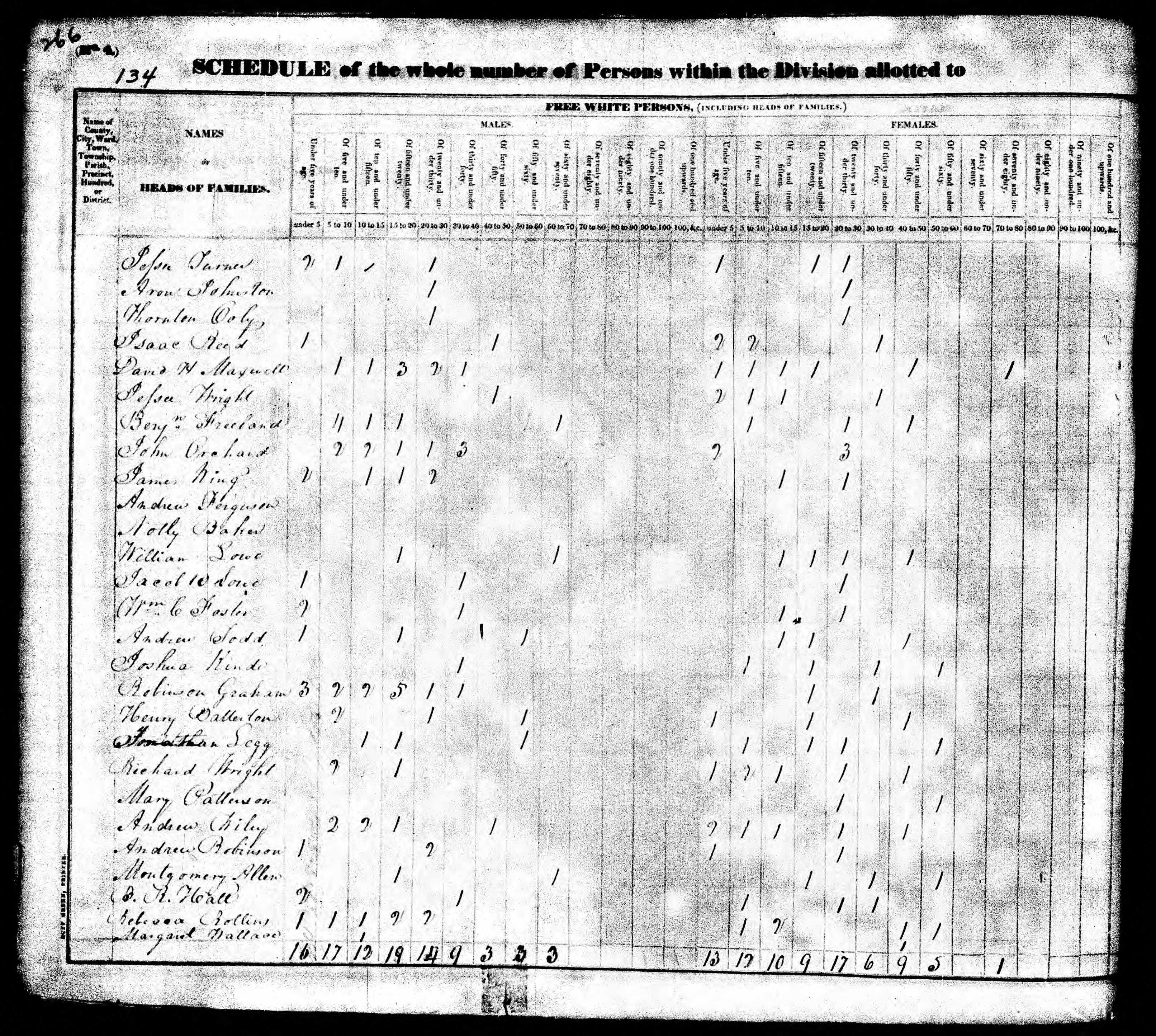 Andrew Ferguson moved to Indiana (which became a state in 1816) after the Revolutionary War. The 1830 United States Census, shown here, documents Ferguson’s residence in Monroe County. Ferguson is listed as a “Free Colored” man between the ages of 55 and 100. A “Free Colored” woman between the ages of 36 and 55, possibly his first wife, is listed in Andrew’s household. No other family members are documented in their household.