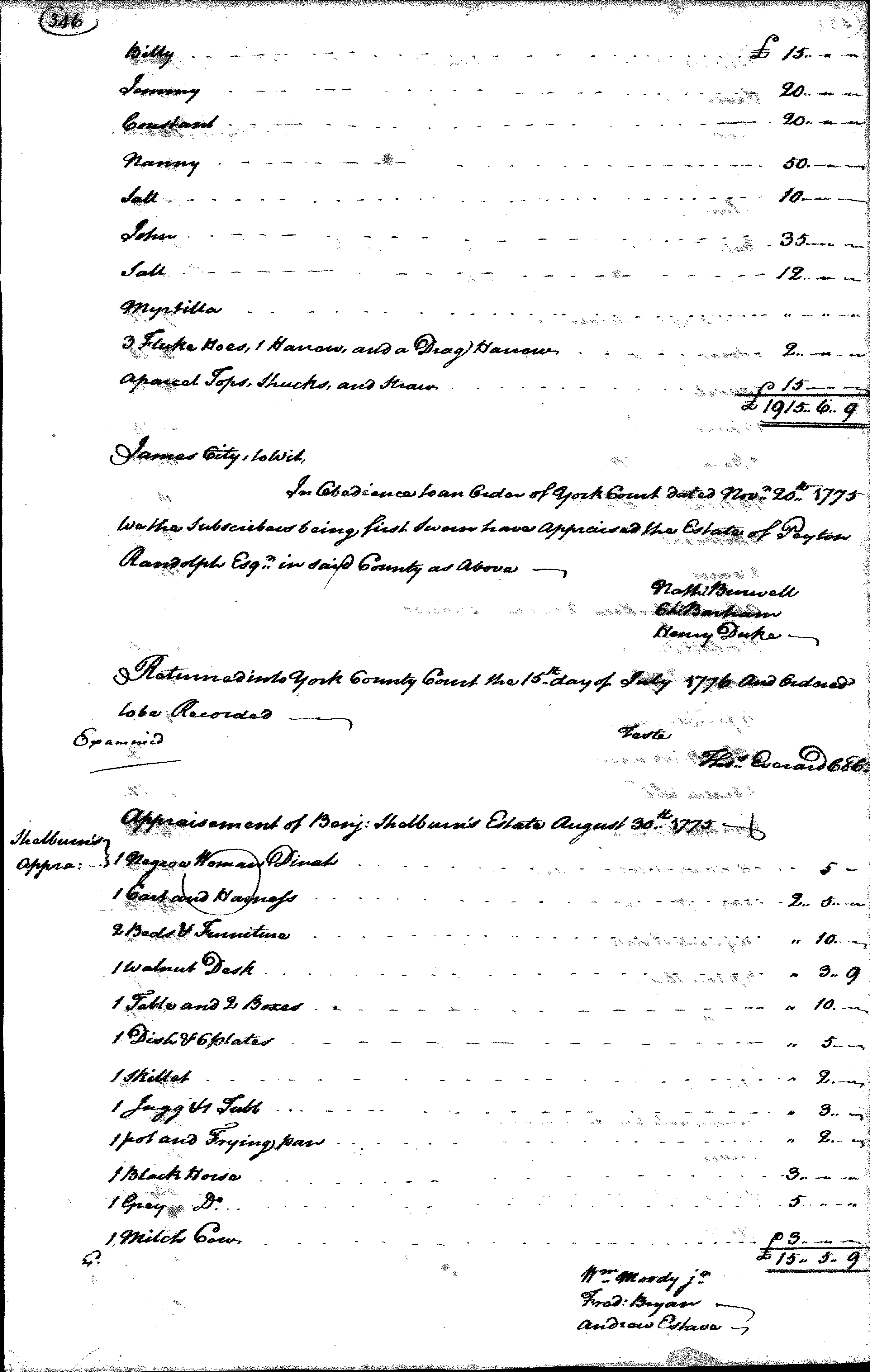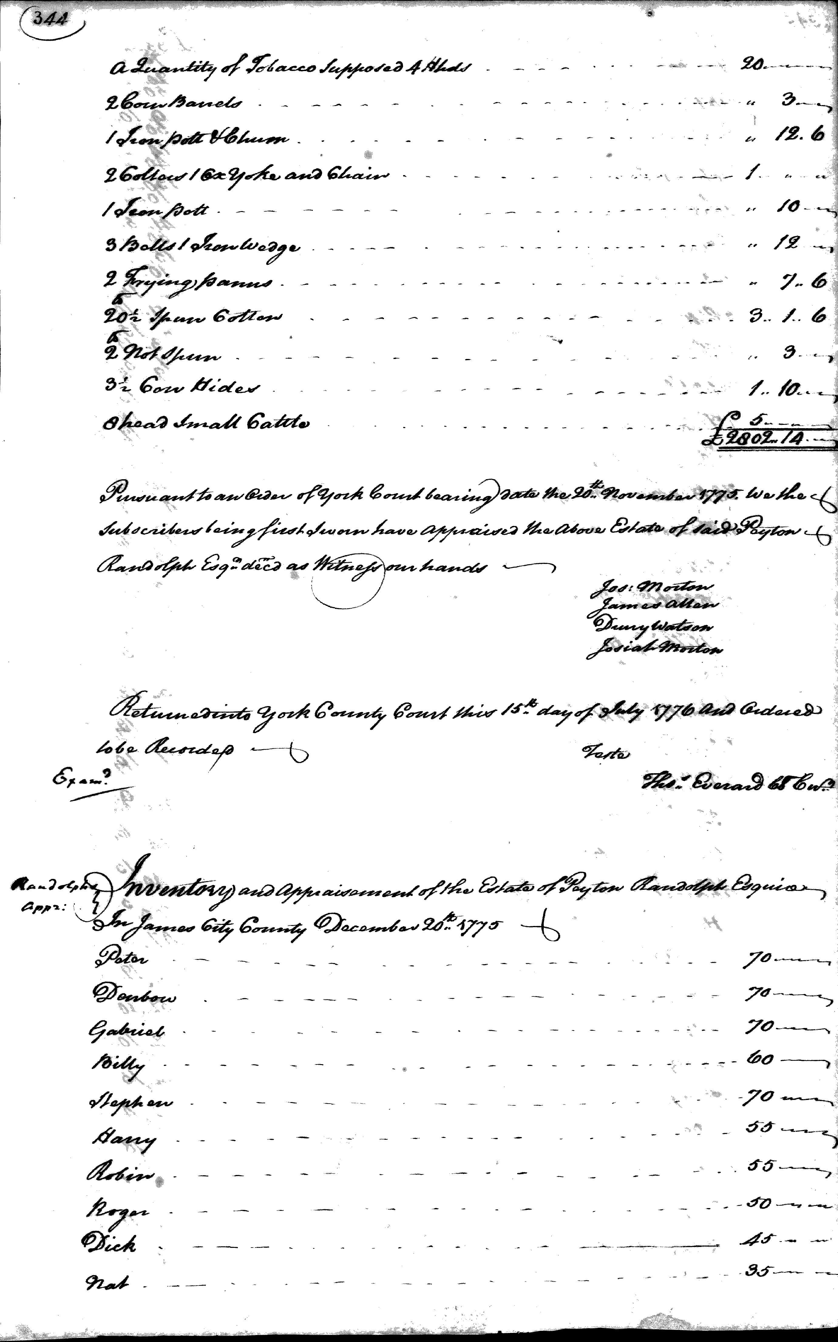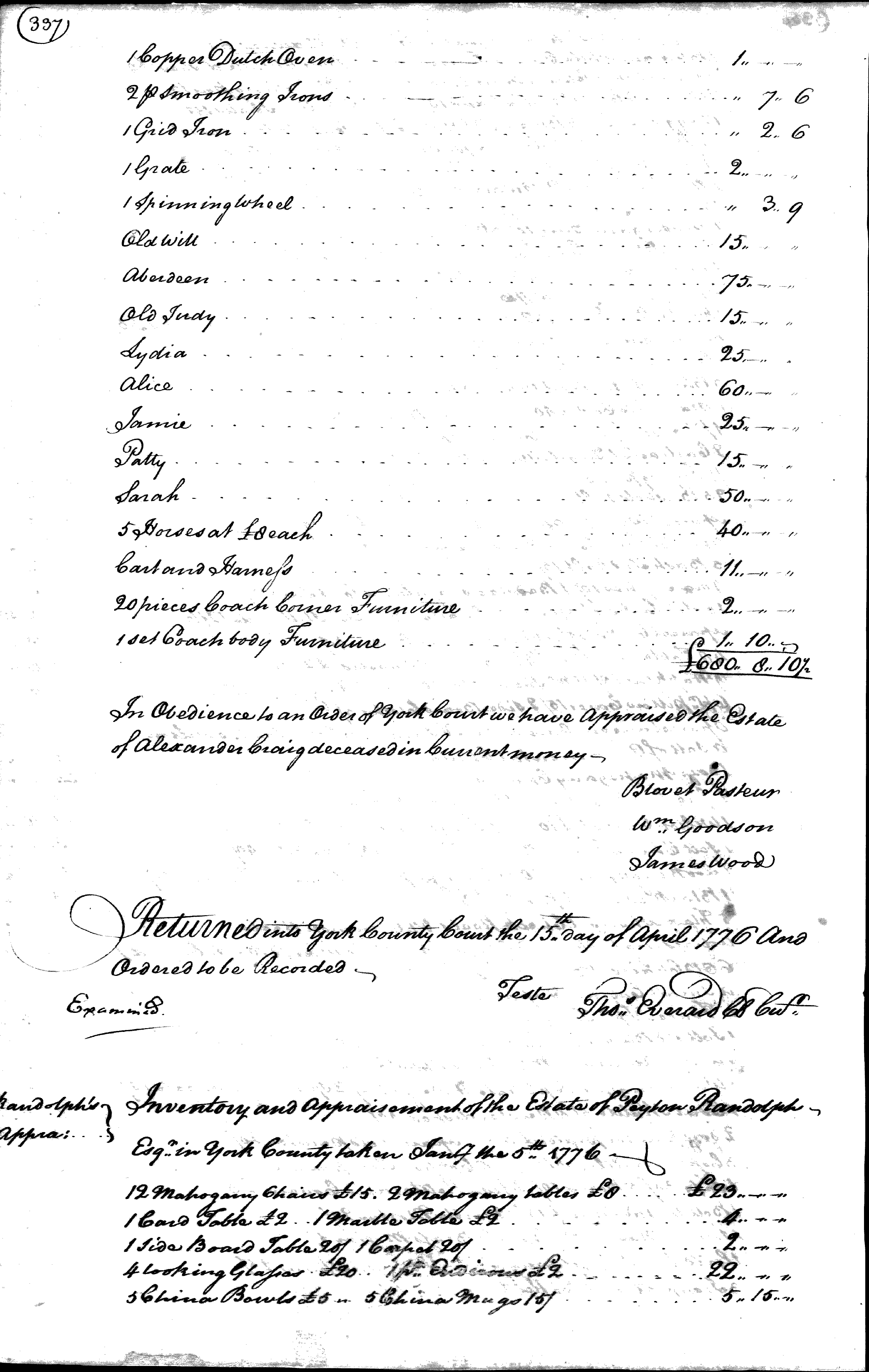 Following Peyton Randolph’s death in 1775, York County, Virginia, officials recorded this inventory of his possessions. The names and values (in pounds) of the enslaved people he owned are recorded on pages four through ten of the inventory. Eve’s name is listed on page five of the inventory, while her son George’s name is listed on page four. Eve and another woman named Betty were assigned values of 100 pounds each, the highest values among the enslaved women recorded in the inventory. These high values suggest that Eve and Betty worked in the Randolph home. Eve’s status may have changed following her attempt to escape from the Randolph family with her son in search of freedom. At least two handwritten copies of this inventory survive. The other copy includes the notation “gone to the enemy” next to the names of Eve and George, referring to when they first ran away from the Randolph family in search of their freedom in late-1775 or early-1776.